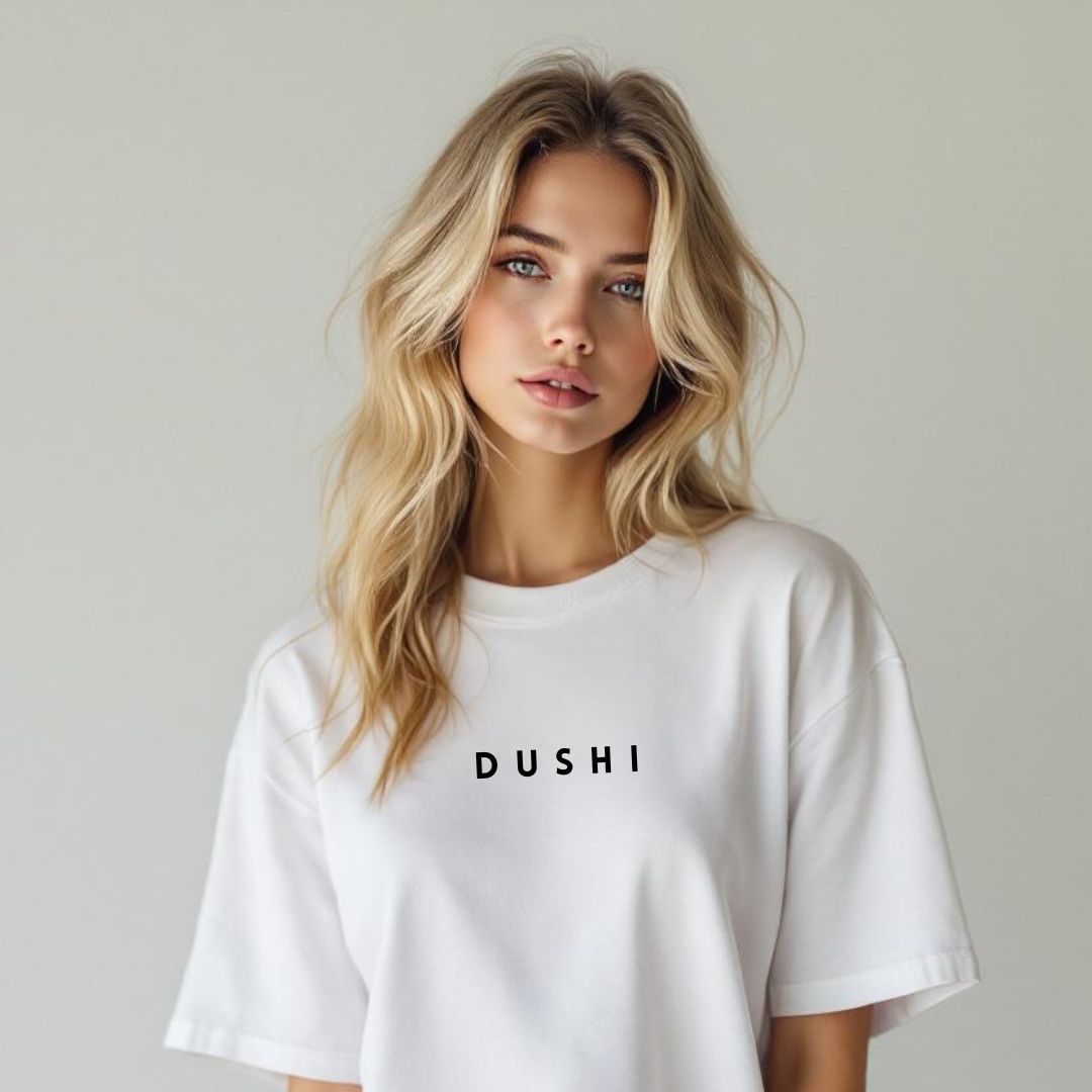 Tricou alb oversized dama „Dushi”, 100% bumbac. Croiala unisex.